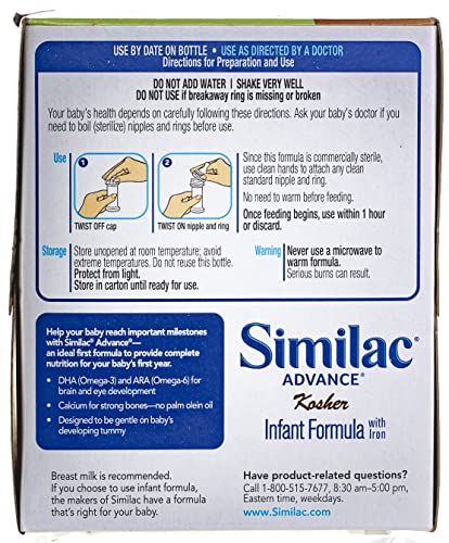 Similac Advance Kosher Infant Formula with Iron, 2 Fl OZ – 4 Bottles (2 Pack = 8 Bottles) Milk Based, Ready To Feed, Resealable Bottle, Cholov Yisroel, (0-12 Months)